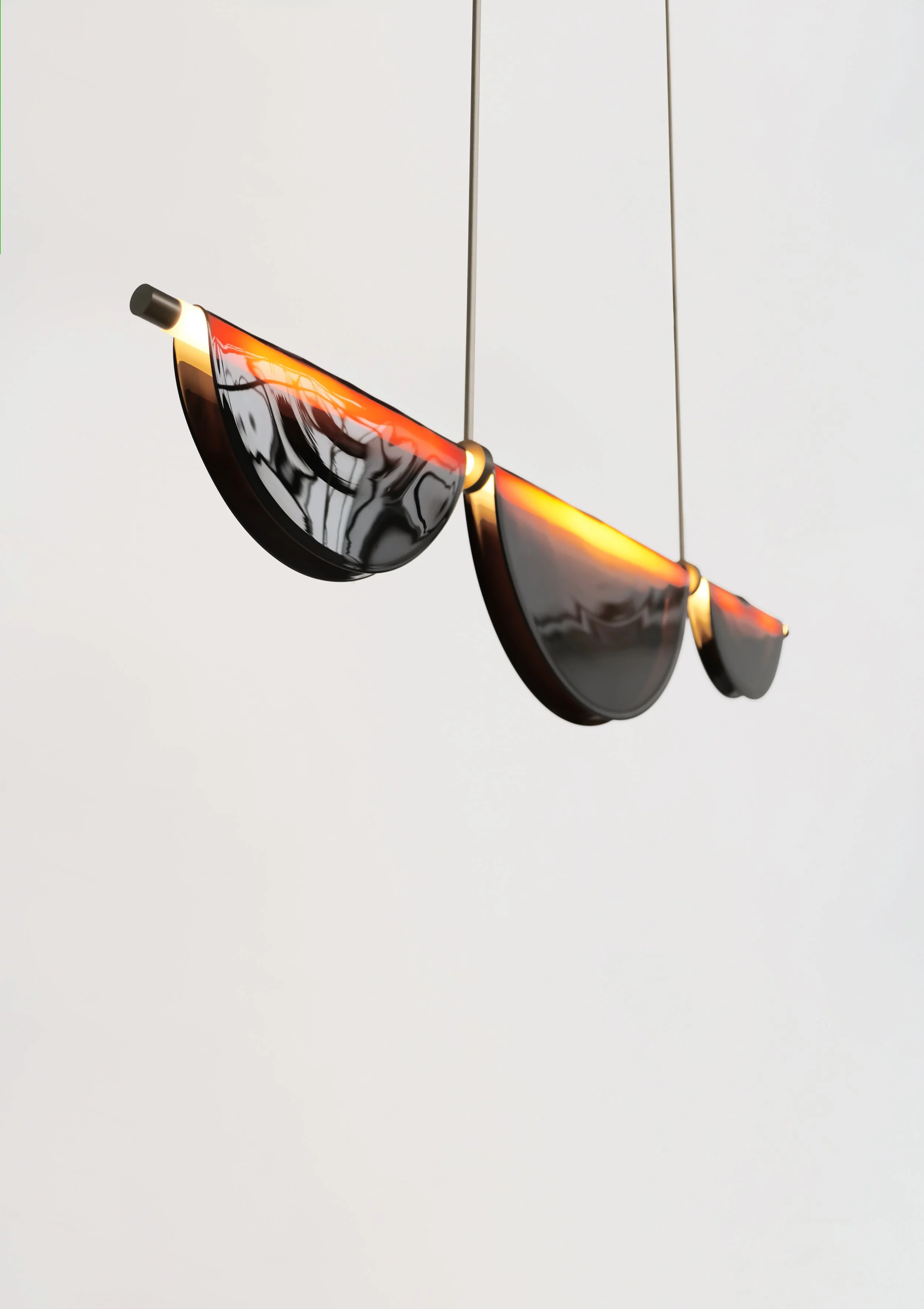 Graced with a tube designed to diffuse perfectly homogeneous light, the chandelier is adorned with three folded cives. Like a membrane enveloping light, Cive Pliée is the object of the crystallization of time.